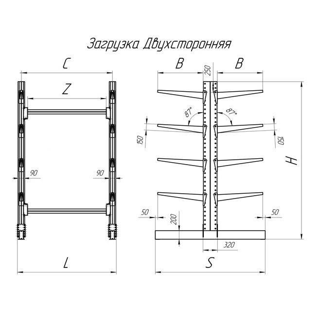 Стеллаж консольный островной металлический (C*S*H) 1750*2900*1500 мм имеет 1 ярус с нагрузкой до 1000 кг на 2 консоли.